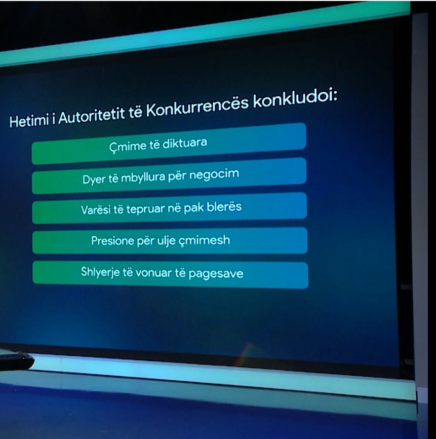 „Wir werden an den meisten Punkten noch ein Auge und ein Ohr haben. Wir werden eine Spezialeinheit haben, um zu sehen, ob es dieses Jahresende zu Preismissbrauch kommt. Alle Märkte und Lebensmittelunternehmen werden überwacht. Wir wollen alle Händler darauf aufmerksam machen, dass sie keinen unfairen Missbrauch betreiben“, erklärte der Leiter der Wettbewerbsbehörde, Denar Biba, während eines Interviews auf Vizion Plus für die E-ZONE-Show.